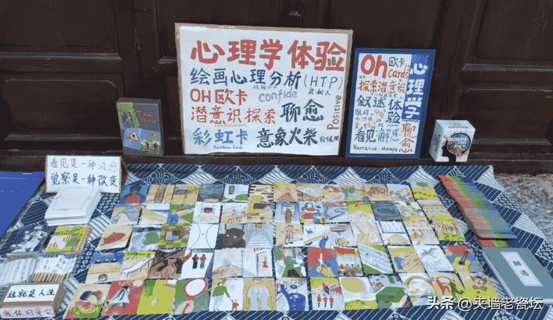 在“拙木”的心理咨询摊位,摆放着大量的欧卡(心理测试潜意识投射卡中的代表,由两组牌所组成的,分别是 88 张图像卡以及 88 张文字卡,总共是 176 张卡片),而这些欧卡正是趣味型引流的代表。“拙木”的摊位引流主要来源于此。